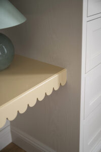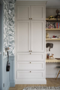 Platsbyggd förvaring och arbets och pysselbord till barnrum.